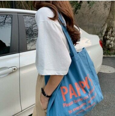 ブルー地にサーモンピンク色の英字が映える✴︎主役級のショルダーバッグです。