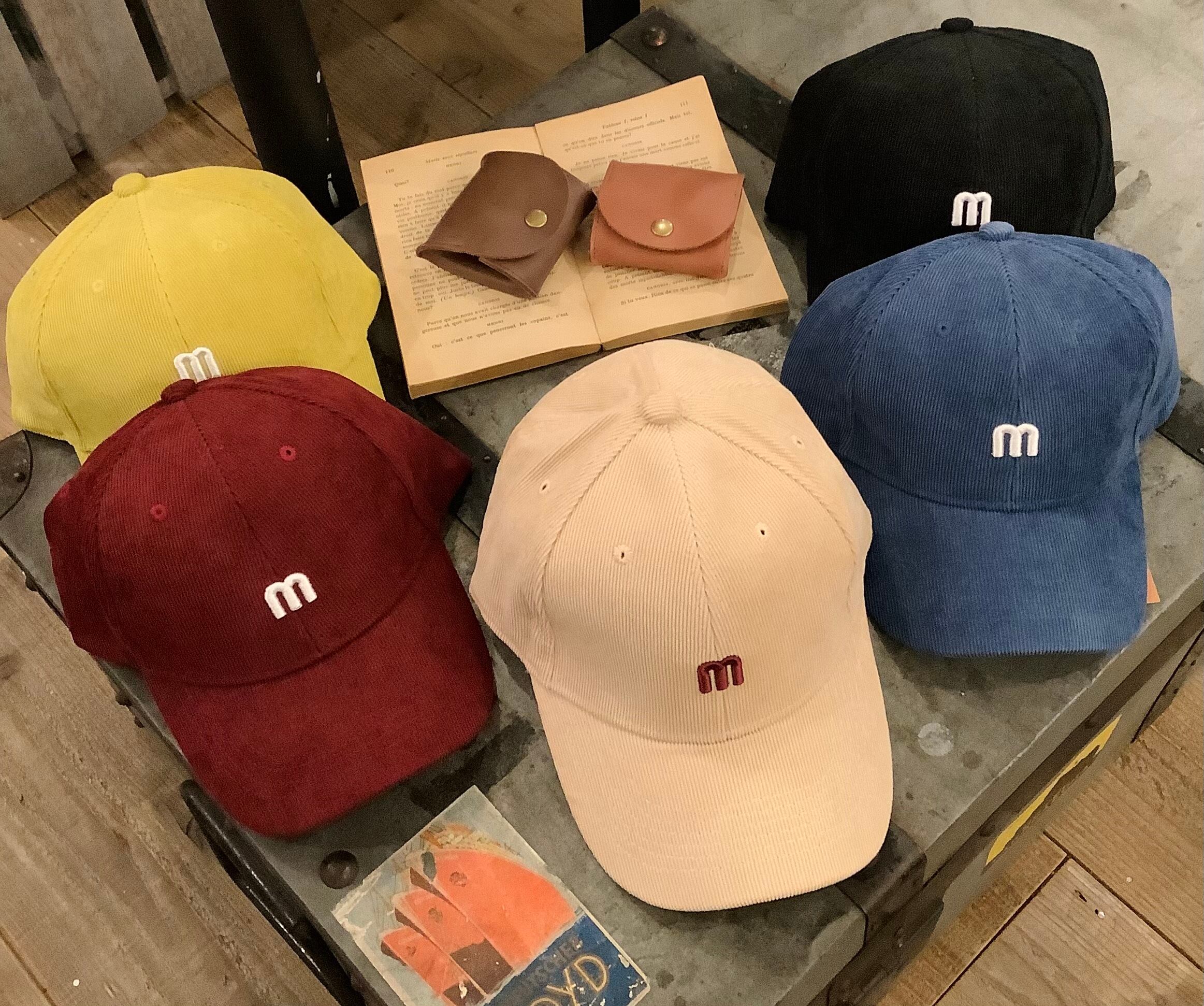 季節感たっぷりなコーデュロイ、素材刺繍ロゴ入りCAP。