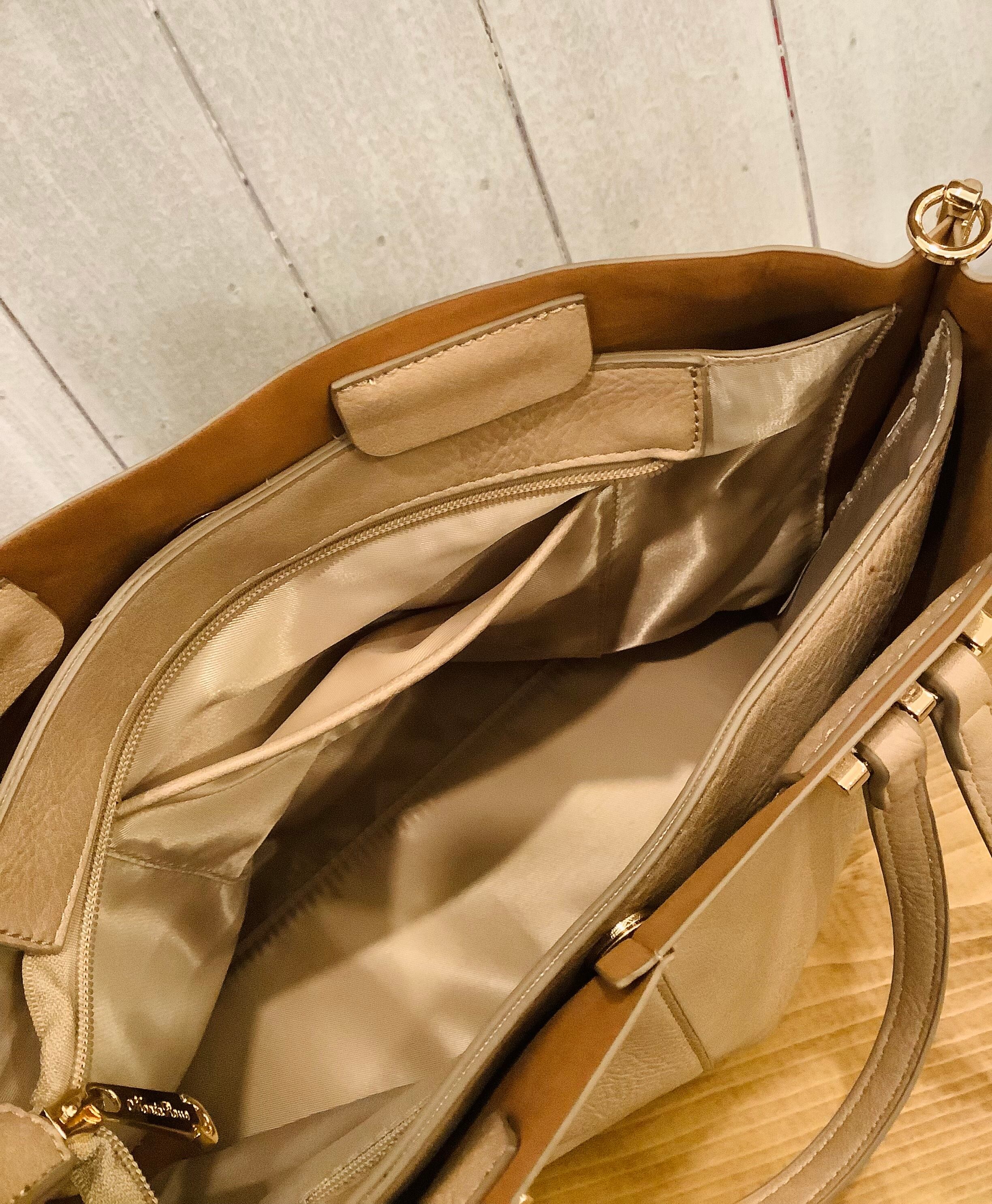 トートとショルダーで使え、ポケットの多さや仕切りに、雨の日もお手入れ簡単と機能的◎