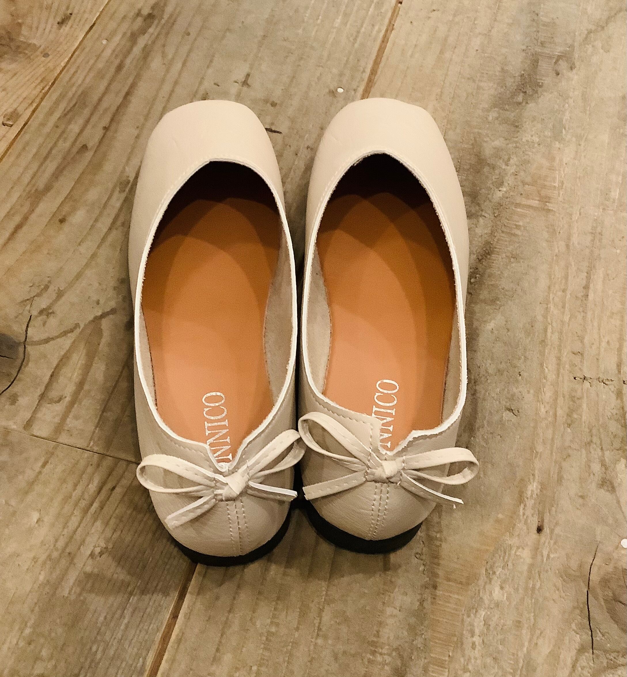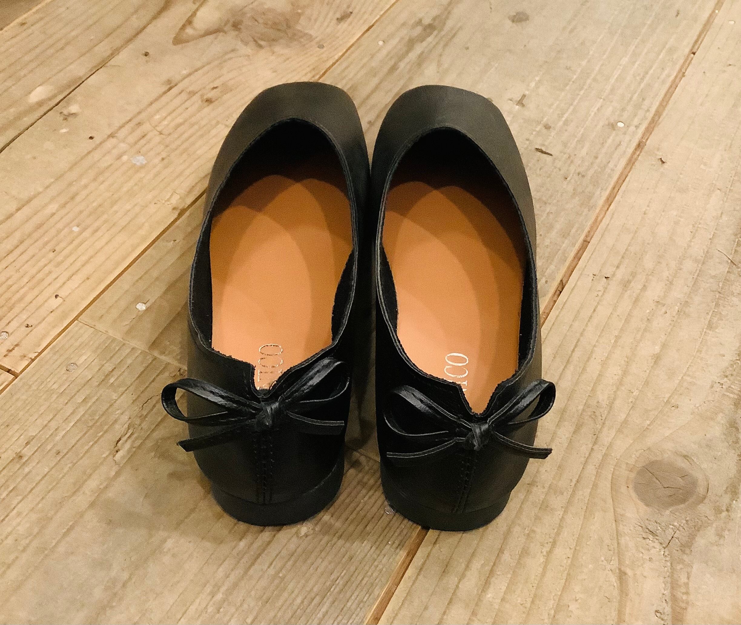 バックリボンがさりげなく可愛いローヒールパンプス。